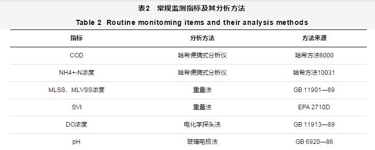 選取NH4+-N濃度和COD作為監測指標,以反映MBBR-MBR組合工藝的脫氮和對有機物的去除效果。試驗中常規監測項目及其分析方法如表2所示。