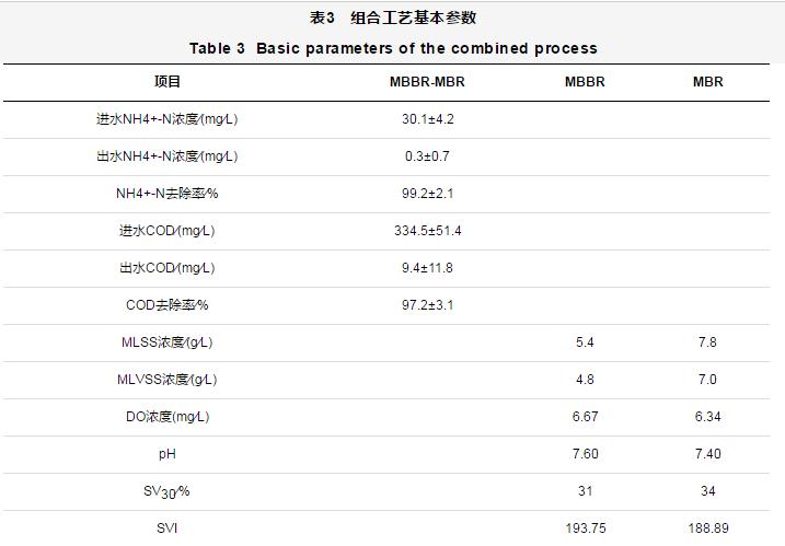 MBBR-MBR組合工藝的基本參數如表3所示。從表3可以看出,NH4+-N和COD的平均去除率分別為99.2%和97.2%,表明該組合工藝對NH4+-N和COD均有較好的去除效果。一方面,由于微生物附著生長在填料表面形成生物膜,曝氣使其處于流化狀態,保證了良好的傳質條件,從而實現了對污染物的高效去除;另一方面,MBR膜組件的完全截留作用使MBR的污泥停留時間與水力停留時間完全分離,同時保持了反應器內很高的污泥濃度,使大量硝化菌在反應器內積累,從而有利于NH4+-N的去除。Shore等[4]驗證了MBBR對NH4+-N有很高的去除率,可達90%。Wang等[14]采用缺氧∕好氧MBR處理食品廢水,NH4+-N進水濃度高達400~660 mg∕L時,去除率超過91%。王勇等[15]對MBR運行過程中活性污泥沉降性能對膜污染的影響進行了研究,結果表明,隨著污泥容積指數(SVI)的增大,膜污染平均速率呈增加趨勢,膜過濾周期逐漸縮短,因此在實際MBR系統運行過程中,應盡可能控制和維持SVI在較低的范圍,以延長膜污染周期,減少運行費用。本試驗中SVI平均值低于200,總體膜污染情況處于良好狀態。