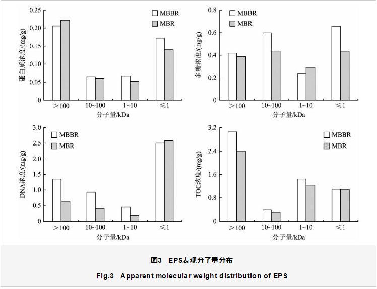通過逐級超濾法對EPS中各組分進行了表觀分子量分級試驗,結果如圖3所示。由圖3可以看出,蛋白質以分子量大于100 kDa的大分子量物質為主,在2個反應器中的濃度均在0.2 mg∕g以上,占40%~47%;分子量小于1 kDa的物質次之,為0.14~0.17 mg∕g;分子量為1~100 kDa的物質濃度最低,約為0.1 mg∕g,僅占20%左右。MBBR中小分子量物質濃度大于MBR,其余分子量的物質濃度相差不大。多糖各分子量的物質濃度相差不大,小于1 kDa的小分子量物質和10~100 kDa物質的濃度接近,為0.5 mg∕g左右,占22%~34%。但在MBBR中小分子量物質的濃度明顯高于MBR。DNA的分子量分布規律和蛋白質相反,小分子量物質濃度明顯高于其他分子量,在2個反應器中均超過2.5 mg∕g,且相差不大,占50%左右;而大分子量物質濃度和中間分子量物質濃度均呈現MBBR中高于MBR。TOC的分子量分布規律和蛋白質基本相同,但其大分子量物質濃度更高,在MBBR中達到了3.0 mg∕g,約占51%,在MBR中也達到了2.4 mg∕g,約占48%;中間分子量物質濃度次之,約為1.5 mg∕g;小分子量物質濃度約為1.0 mg∕g,占20%左右。