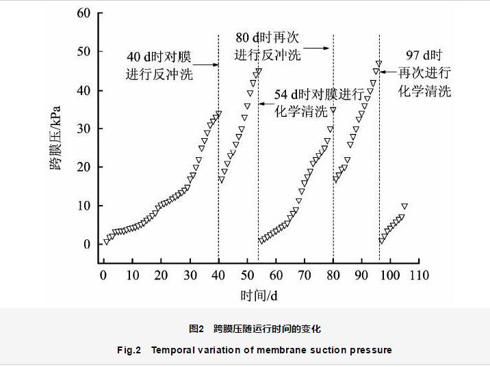 MBR反應器跨膜壓隨運行時間變化見圖2。從圖2可以看出,隨反應器運行時間增加,跨膜壓增大速率先慢后快。膜表面的泥餅層處于一種動態平衡狀態,成為過濾的主要阻力[16]。運行40 d時,MBR內跨膜壓達到35 kPa,首次對膜進行反沖洗,反沖洗后跨膜壓有所降低;運行54 d時跨膜壓達到45 kPa,對膜組件進行化學清洗,清洗后跨膜壓降至1 kPa;隨著運行時間的增加,很快又出現膜污染現象,且污染速度較反應器使用新膜的初始階段更快,不到30 d跨膜壓便達到35 kPa,表明普通的化學清洗并不能使MBR膜組件恢復至新膜水平,這可能是由于一些小粒徑物質吸附在膜表面堵塞了膜孔所致。Wisniewski等[17]用微濾膜過濾城市污水處理廠的污泥,考察不同膜面流速下溶解性物質對膜污染的影響,得出溶解性物質引起的膜污染幾乎構成了50%的膜過濾阻力。Meng等[18]報道了SMP除了容易在膜面沉積外,還會引起膜孔濾餅層內后生孔道的堵塞,使膜阻力大幅升高。在整個試驗過程中,膜組件清洗的周期隨著運行時間的增加逐漸縮短,說明有些膜污染是不可逆的。