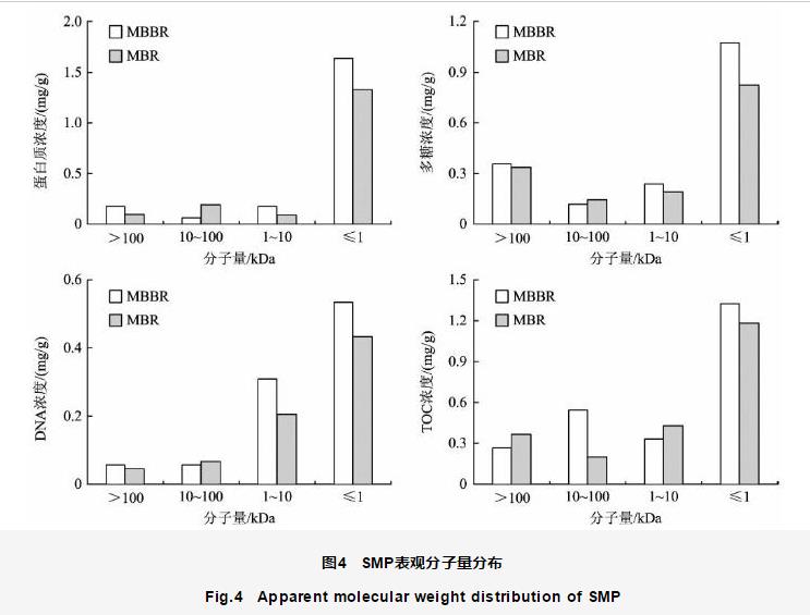 SMP中各組分分子量分布如圖4所示。從圖4可以看出,蛋白質的分子量分布以小分子量物質為主,其濃度遠高于其他分子量物質,在2個反應器中均超過1.3 mg∕g,約占80%,且MBBR中濃度大于MBR;其他分子量物質濃度均較低,不足0.2 mg∕g。多糖的分子量分布規律與蛋白質基本相同,也是以小分子量物質為主,占50%以上;中間分子量物質濃度與大分子量物質濃度較接近,均在0.3 mg∕g左右。DNA的分子量分布也以小分子量物質為主,濃度約為0.5 mg∕g,占55%以上;其次是中間分子量物質,中間分子量物質中又以1~10 kDa分子量物質為主,占30%左右;大分子量物質濃度較低,在MBBR中為0.05 mg∕g,在MBR中濃度更低,僅占6%。TOC的分子量分布與DNA相似,不同分子量的物質濃度由高到低依次為小分子量物質(占50%以上)、中間分子量物質、大分子量物質(占20%以下),且MBBR中的大分子量物質濃度低于MBR,中間分子量物質濃度高于MBR。